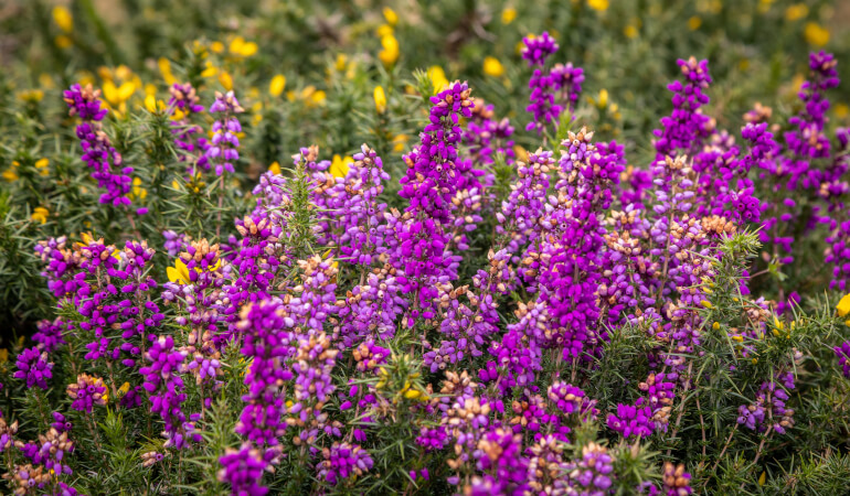 Heather is a classic choice for shallow, acidic soil. It adds year-round colour to rockeries, slopes, and shallow beds.